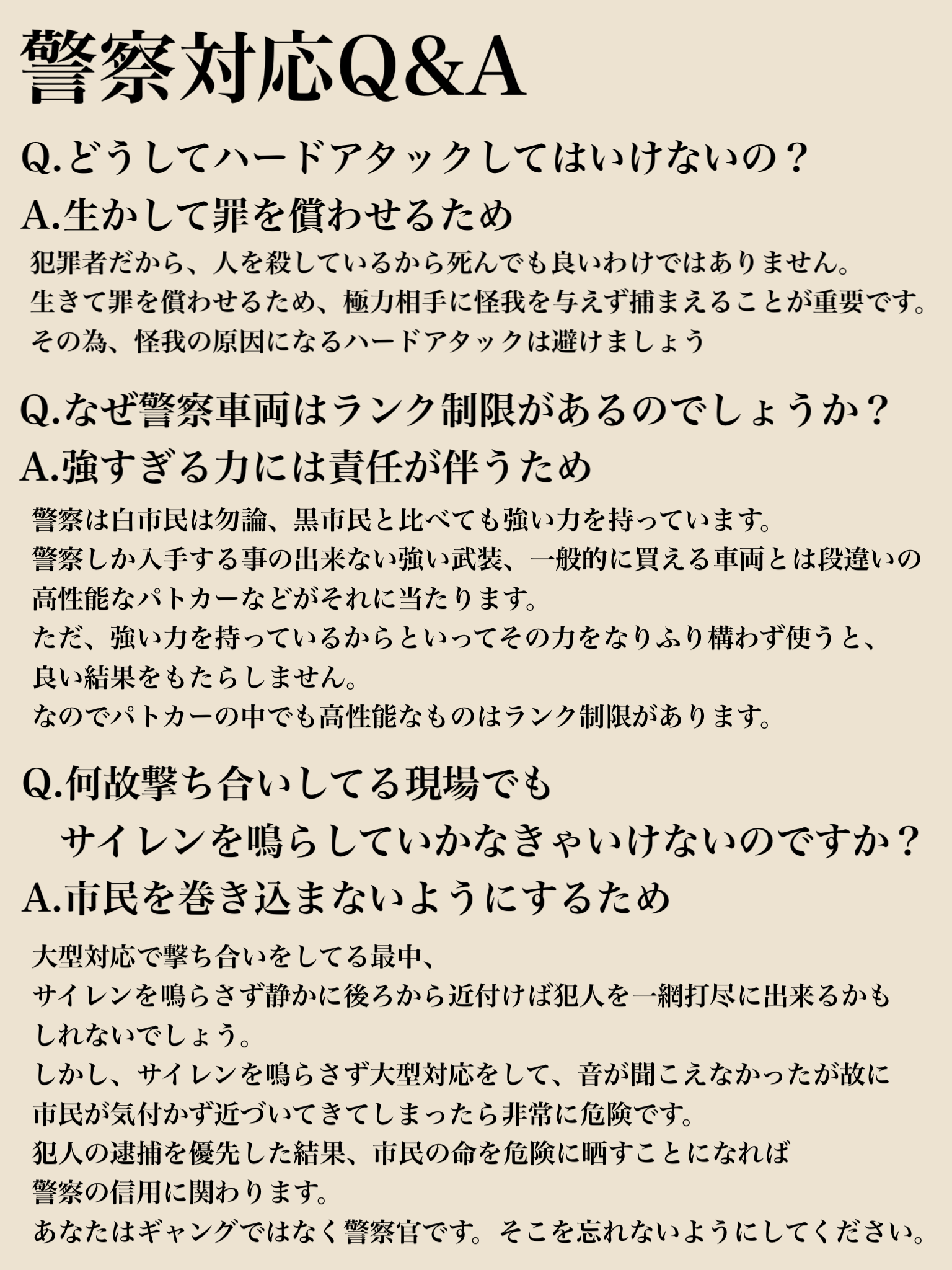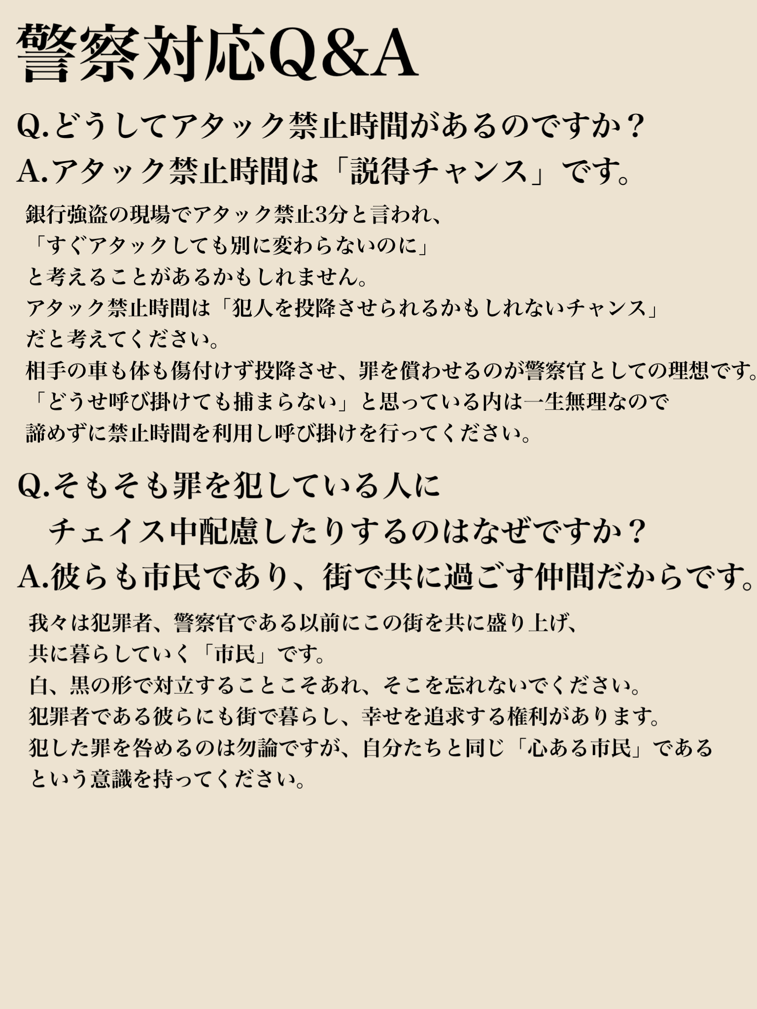 パトロール / 街案内 / 市民対応 / 犯罪対応 / 逮捕・押収 / 強盗・通報対応 など
